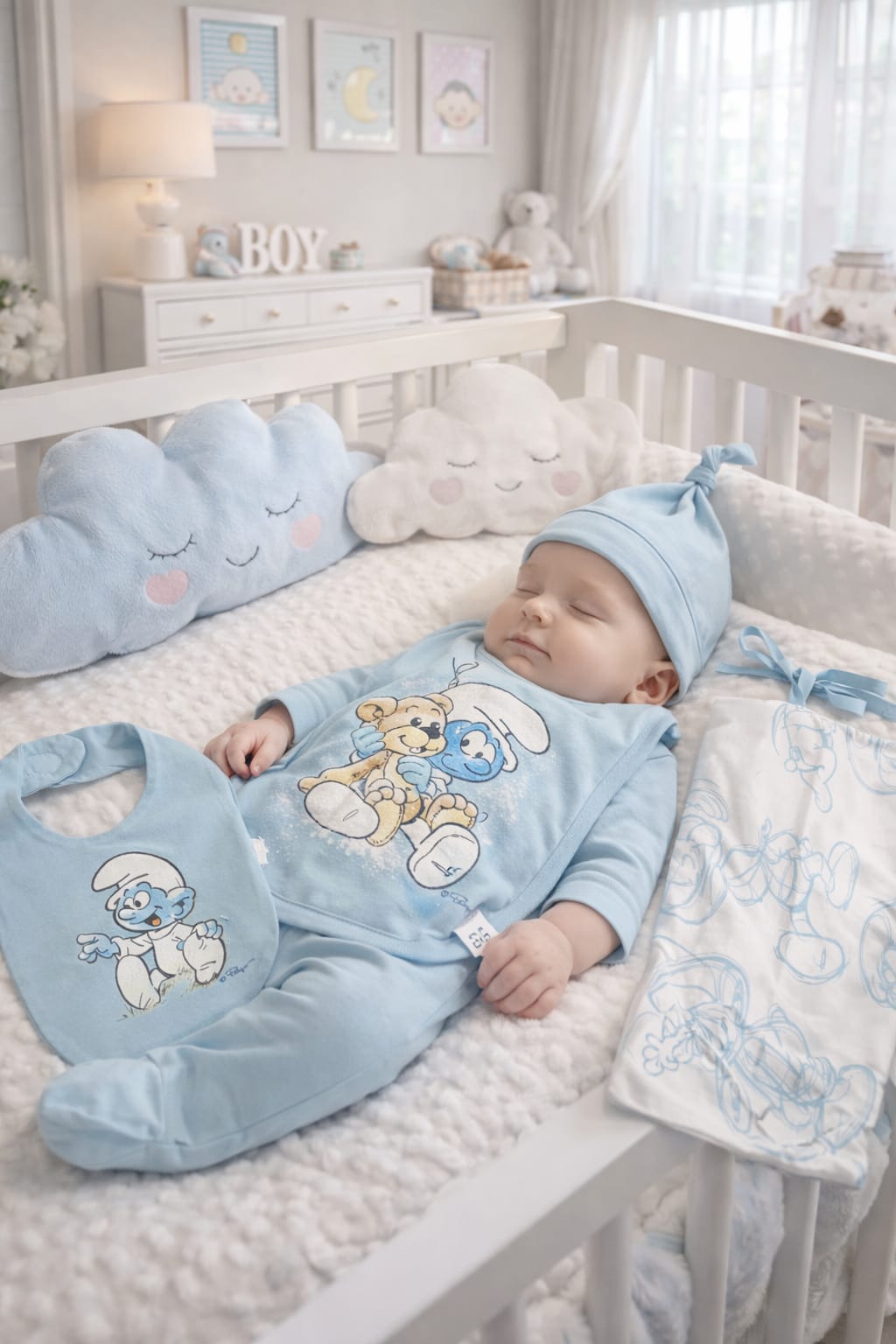 Sono in cotone biologico le tutine complete di cappellino sacchetto primo cambio bavetta,il pagliaccetto solo bavetta e sacchetto sono melby un'azienda che fa 5p anni cura l'interesse del bimbo