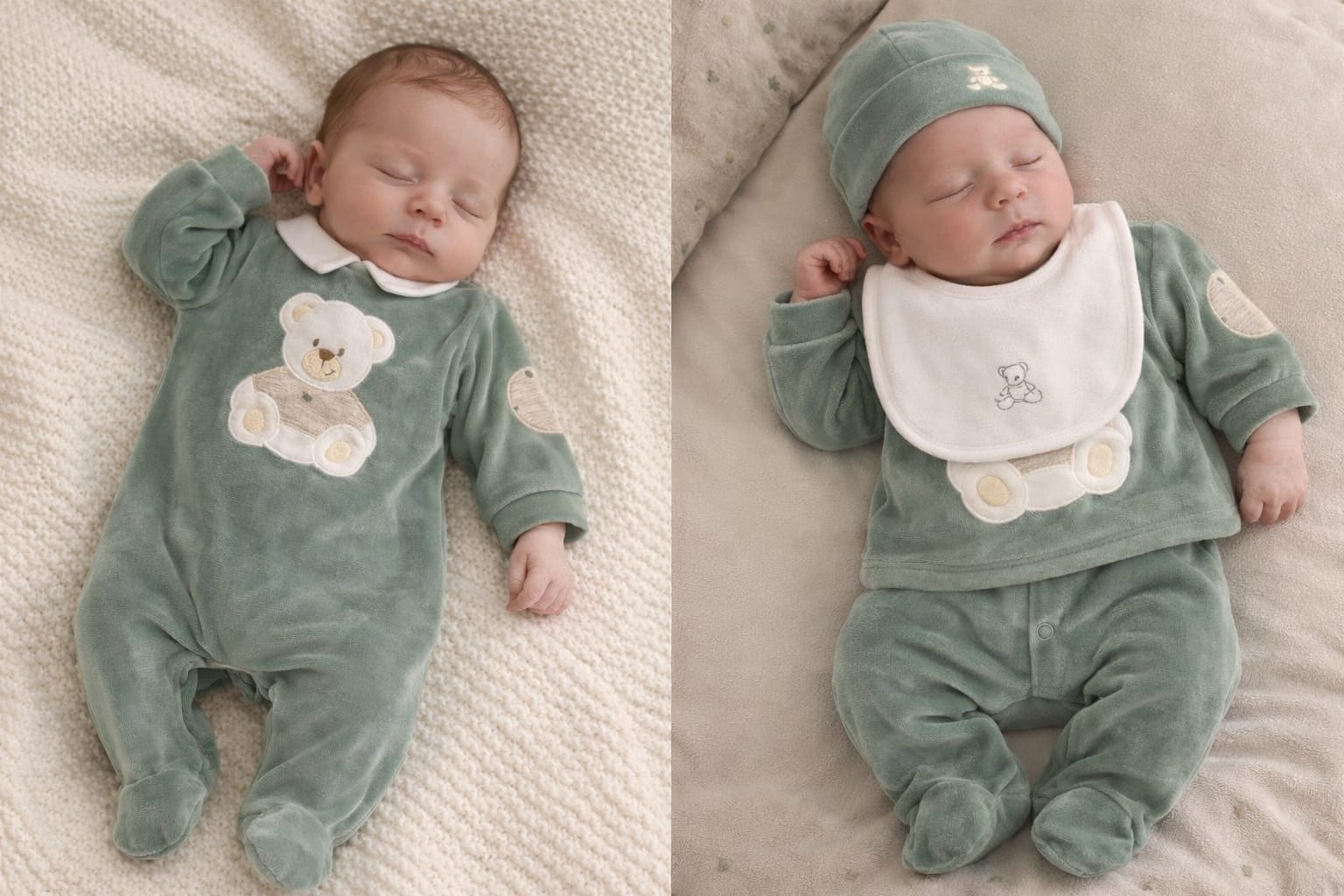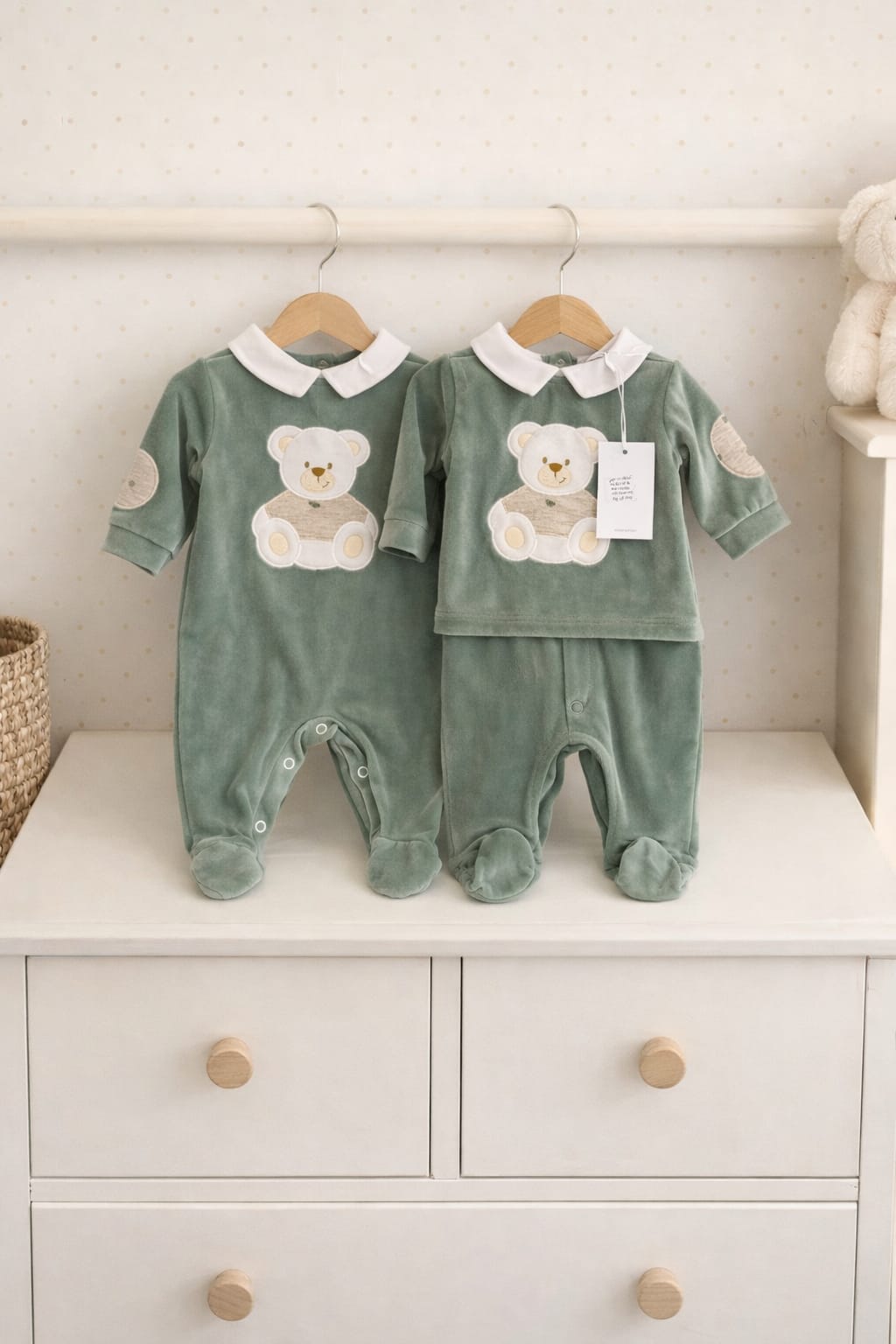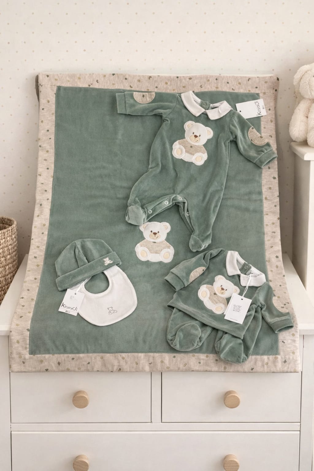 Il set comprende la copertina ,il cappellino,la bavetta,la tutina oppure a scelta il completino,adatto da fine ottobre a fine aprile ,un azienda made in Italy alla portata di tutti ,la ciniglia non è altro che un caldo cotone all'80% il restante è il pelo per la morbidezza.